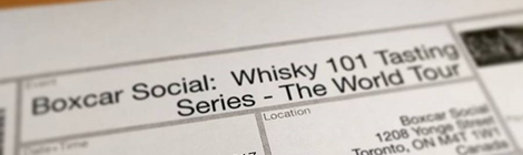 Last night I went to the first (my first, anyway) in a series of whisky tastings at Boxcar Social. A while back I met the whisky director there, and he told me they’d be running events. Lo and behold, they did, and I came. It was probably a little beginner-y for me, but still worth it to help me structure my thoughts and notes about different whiskies.