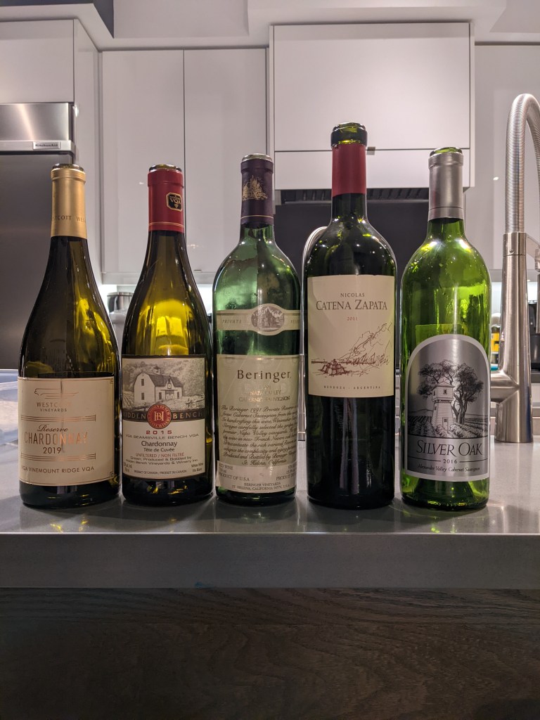 We went to visit friends D+K at their house last night, after trying to make it happen for nearly a year. They very generously made us a delicious dinner — charcuterie, mushroom risotto with prawns and scallops, wagyu steak, and grilled corn. We drank a lot of great wine too: 2019 Westcott Reserve Chardonnay, 1991 Beringer Cabernet, and 2016 Silver Oak Cabernet from their cellar; 2015 Hidden Bench Tête de Cuvée Chardonnay and 2011 Catena Zapata Nicolás from ours. We even got some doggy scratches in. Good night all around.