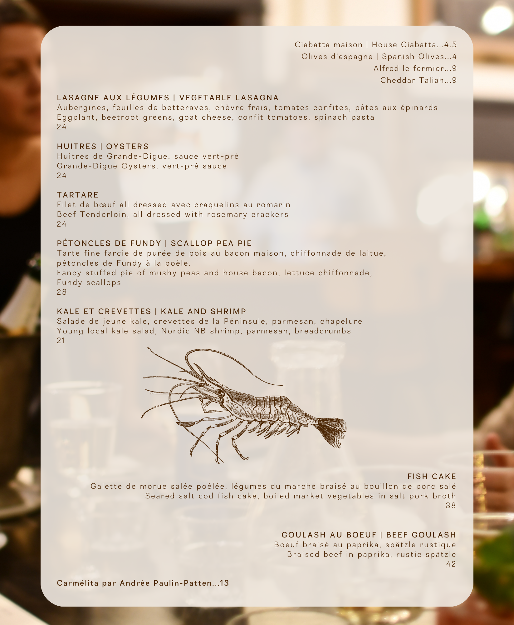 I’m in Moncton this week. A&D drove over for dinner this evening, which was the perfect excuse to finally try Les Brumes du Coude. It’s a lovely casual vibe inside, and the food was wonderful. We shared everything (except that glass of Pineau).