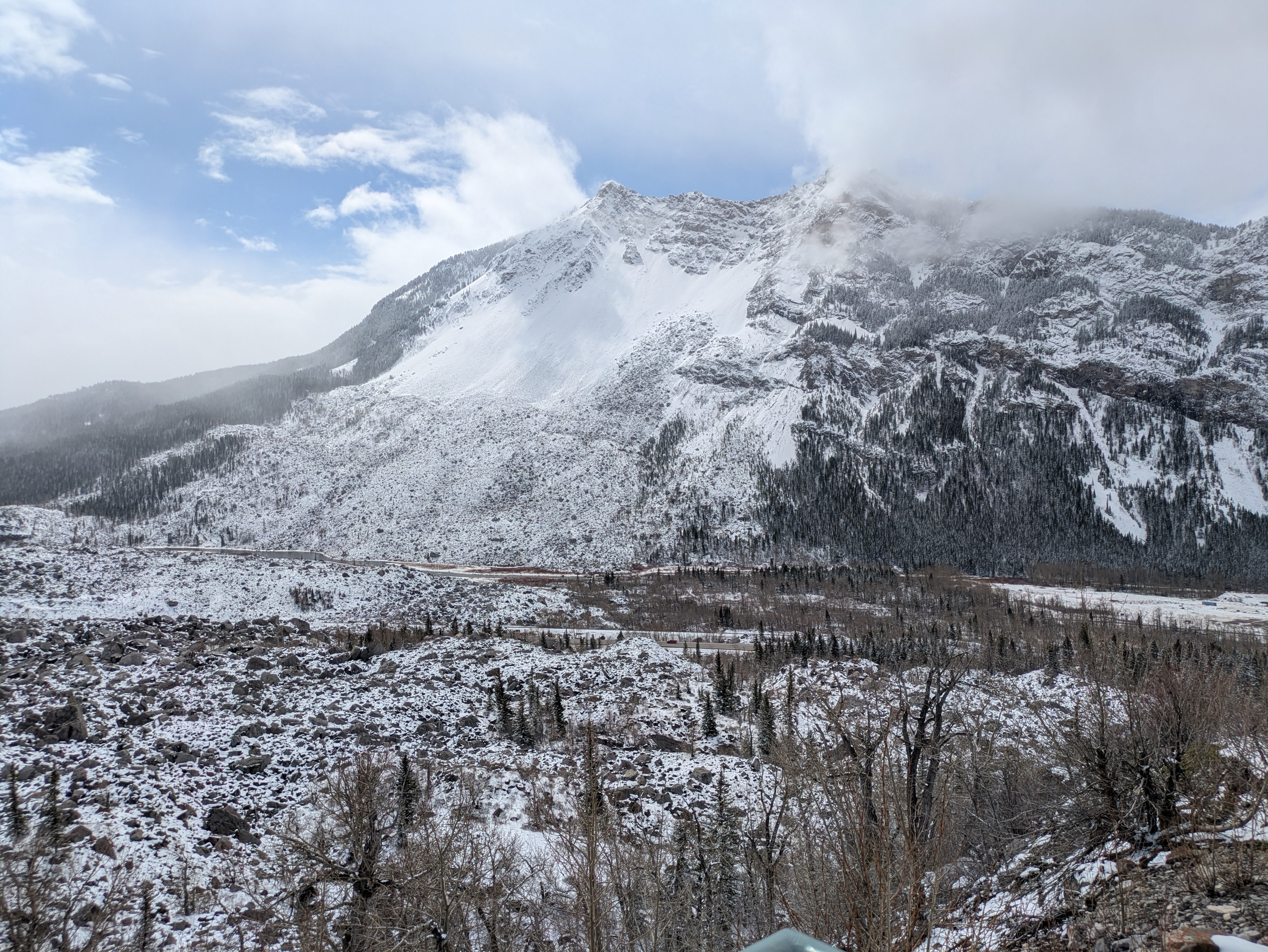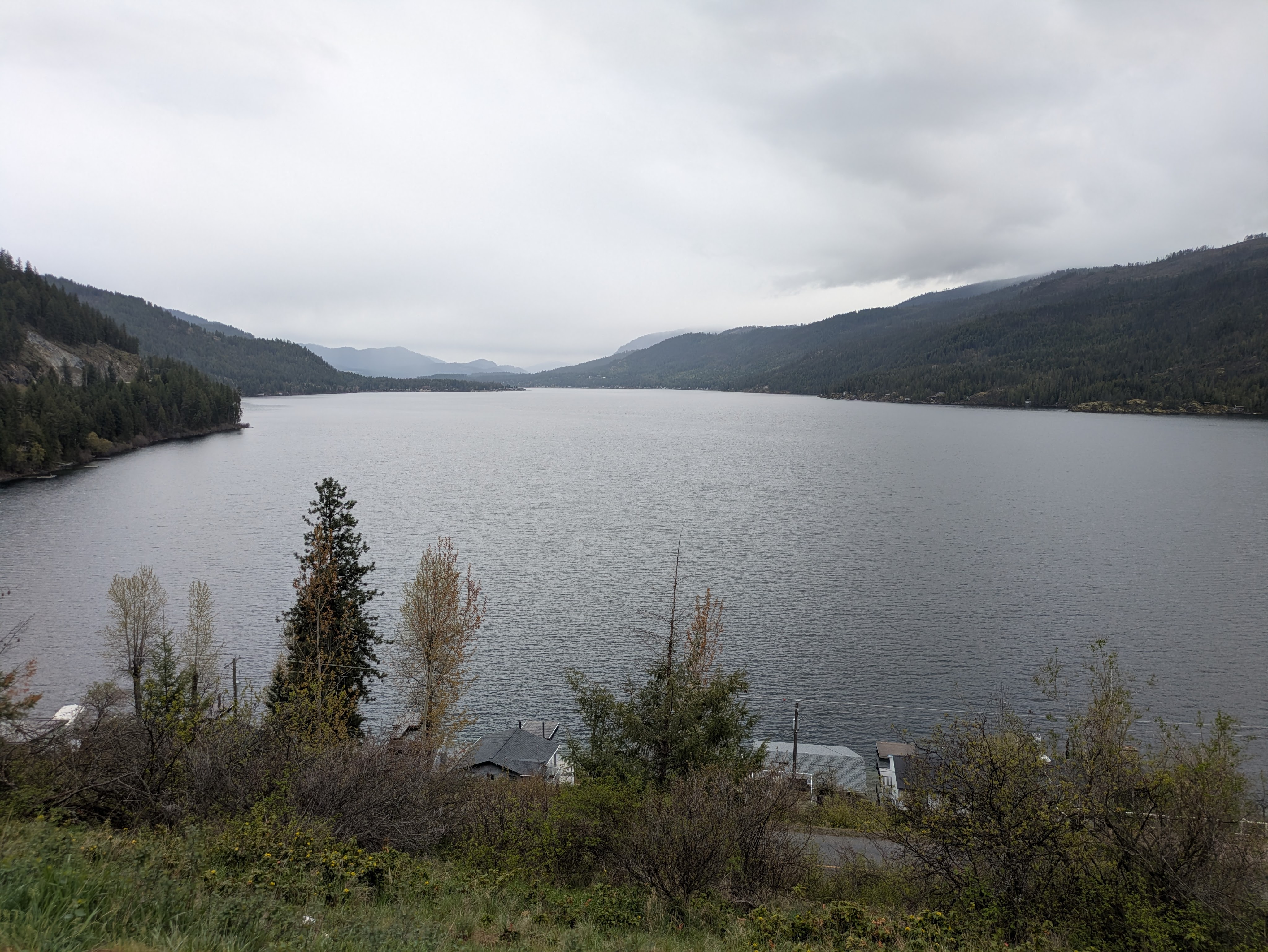 A few minutes after leaving the lake, we began another climb. We saw signs about needing winter tires through the end of April, but given how warm it had been when we left Osoyoos we figured it didn’t apply that day. Silly us. Not ten minutes later, we found ourselves in the middle of a snowstorm. Five minutes after that, as we drove over the Paulson Pass, we lost control of the car in the snow-covered road at least once. (It turns out we had all-weather mud + snow tires, but not full winters.) We managed to keep it on the road, white-knuckling until we descended toward Castlegar and the snow turned back into rain.