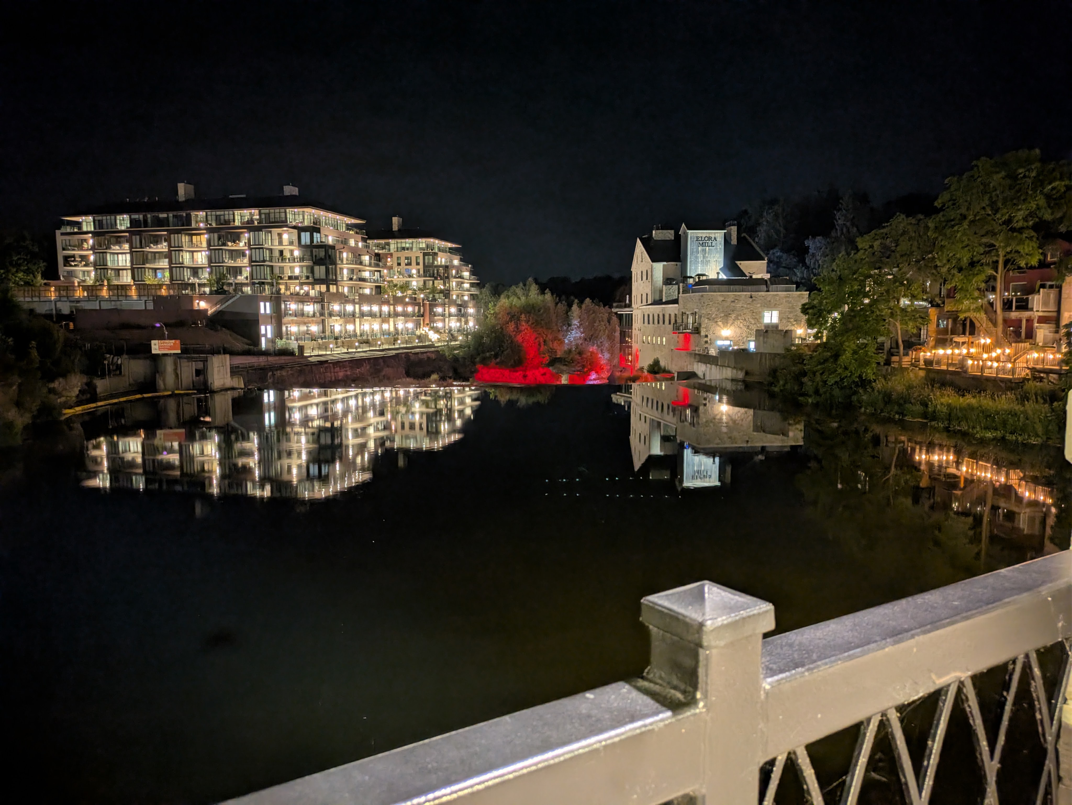 After another full workday we drove crawled to Elora, arriving at the Elora Mill just in time for our dinner reservation. We sat outside and ordered the Celebration menu, which was a four course tasting menu — or rather, two different versions, so we could share. I can’t remember all the details of each course, but here it is to the best of my memory:
